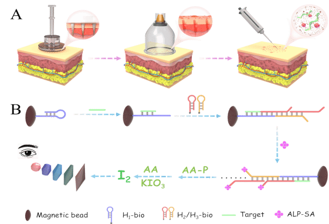 图1 (A)微针——拔罐高效提取皮肤间质液示意图,(B)多色彩可视化检测皮肤间质液miRNA示意图